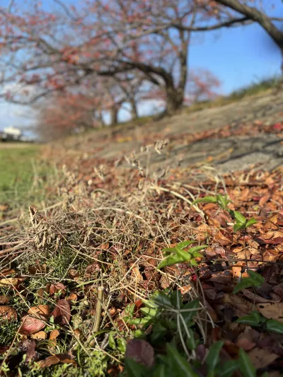 同じような毎日やなと、あくび?をしながら歩いてると、パッと風に吹かれた大量の落葉が地面に重なっていました。