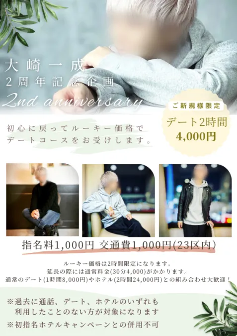 先日のキャスでお話ししましたが2周年記念企画!【ルーキーデートプラン】こちら、完全新規のお客様限定で、2時間4000円のルーキー価格でお伺いします。2時間のみの特別なお値段ですので、延長や追加の場合には通常料金になりますが、ホテルコースとの組み合わせとも可能になっております!!ぜひこの機会に!まずはお問合せからお待ちしています!! -